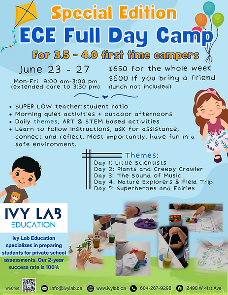 At Ivy Lab, our Early Childhood Education (ECE) programs are led by a consistent team of experienced educators. With small teacher:student ratio, we will know your child and how they learn best. Our lessons and camps introduce age-appropriate topics and skills at just the right time, guided by each student’s individual growth and readiness.
